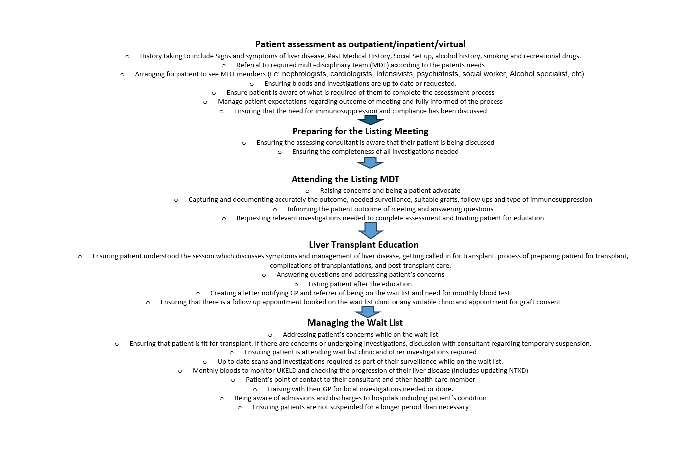 *For further information on the role of the liver transplant coordinator please refer to The Royal College of Nursing. (n.d.). Caring for people with liver disease | Publications | Royal College of Nursing. [online] Available at: https://www.rcn.org.uk/professional-development/publications/pub-007733. This framework describes the professional standards expected of practitioners when caring for people with liver disease including liver transplantation. It includes competencies for liver transplantation. This publication is currently being reviewed; an update is planned for 2025.*