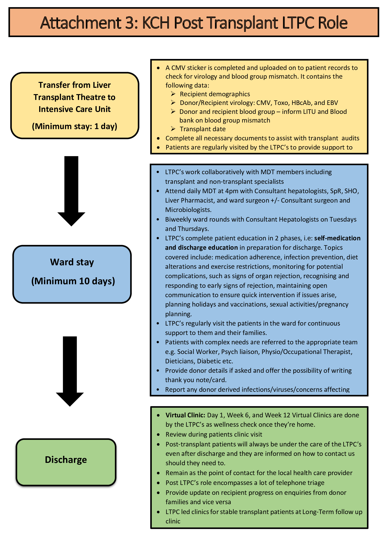 Provide tailored education on self-medication and post-transplant discharge care. Monitor any donor related risk factors and notify the Clinicians/Microbiologists of any updates received from the SNOD’s. Report any adverse events to ODT and comply with local clinical governance policy. Post discharge, monitor through virtual clinics and remain the point of contact for patients and families. See attached flow chart explaining LTPC’s role in post-transplant care.