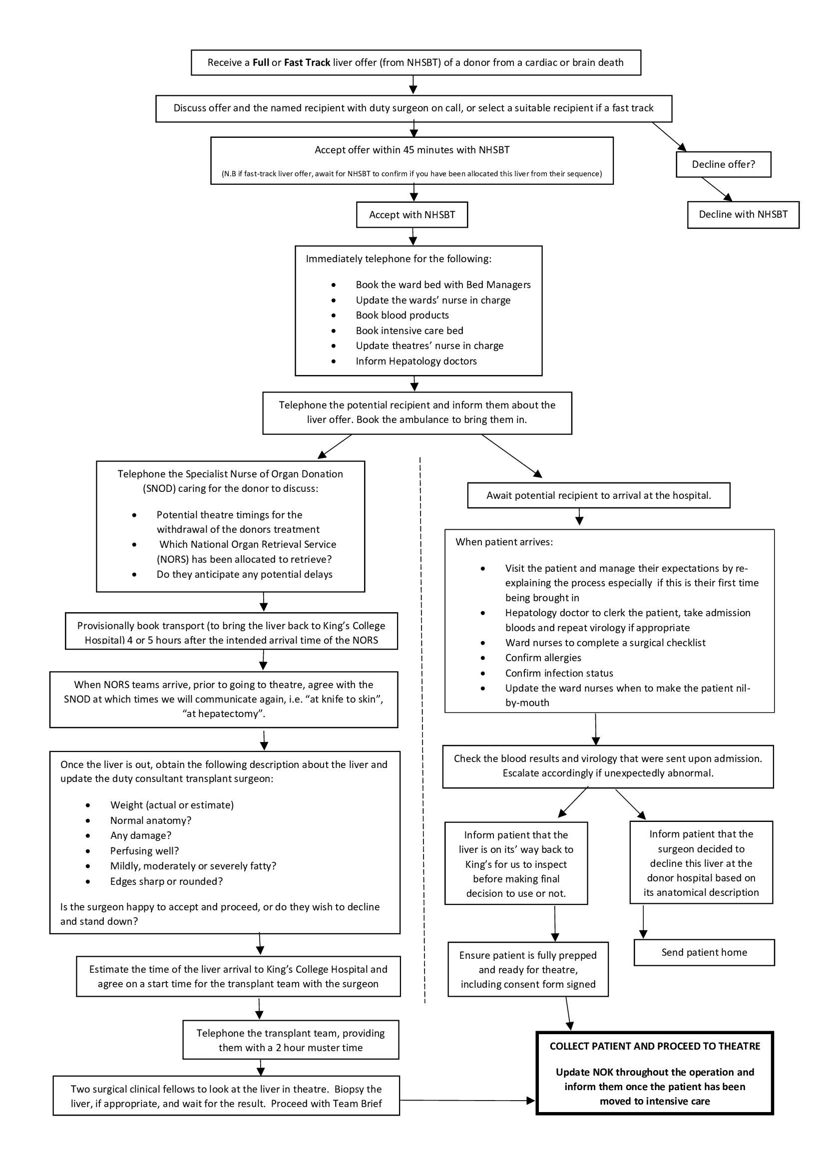 LTPC’s key role includes 24 hour on-call service to facilitate transplant activities: including contacting the potential recipient and manage the logistics of organ allocation and retrieval, liaising with Organ Donor and Transplant (ODT) Hub, Specialist Nurses for Organ Donation (SNOD’s), National Organ Retrieval Service team transplanting surgeon, and the operating theatre staff to plan the time of retrieval and transplant. Also, take a lead role in registering patients with acute liver failure for the super-urgent listing, ensuring they receive timely and appropriate care. This involves support and education of relatives and loved ones in a very acute environment. See attached flow chart explaining LTPC’s oncall responsibilities