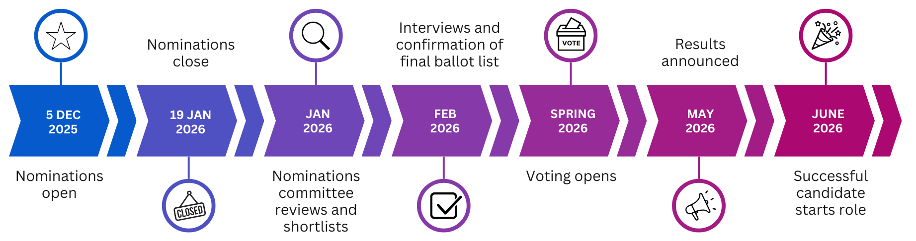 At this stage, members do not need to take any action. Further details about how to nominate, submit questions for candidates, and how the videos will be shared will be communicated ahead of each phase.